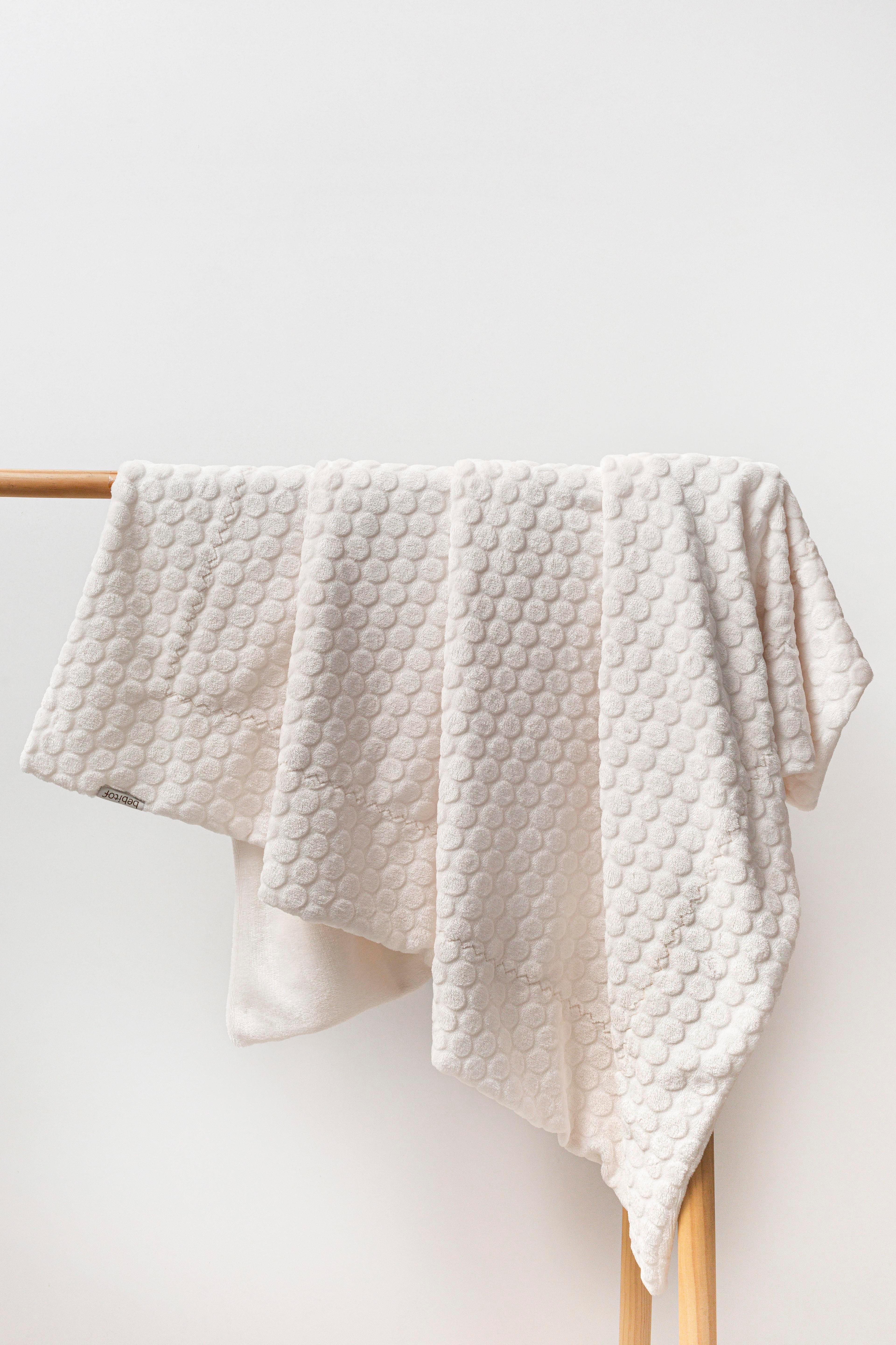 - Kabartma desenleriyle süslenmiş, çocukların odasına neşe katan 90x110 cm boyutlarında peluş ÇİFT KAT bebek battaniyesi.