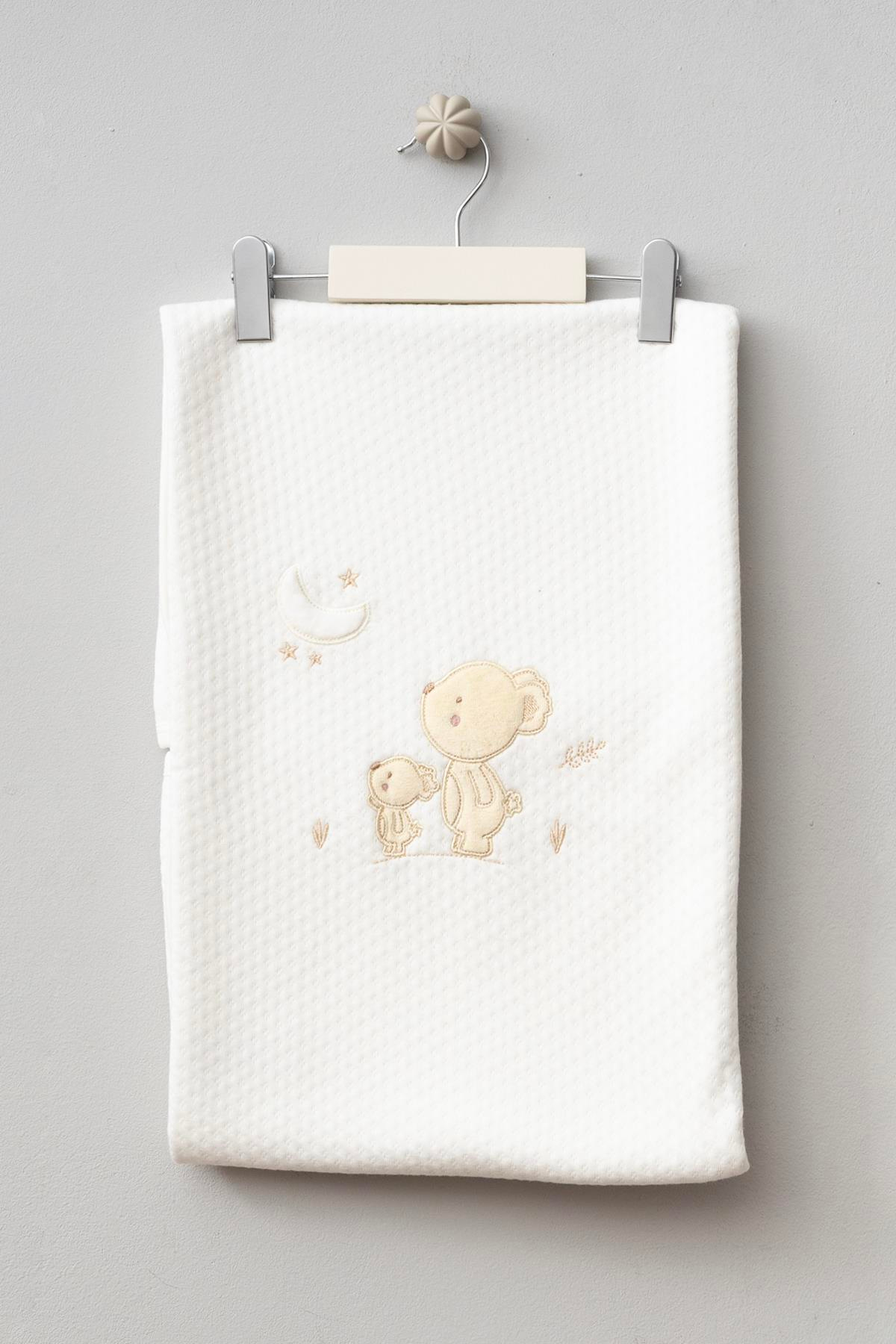 - Sevimli ay ve ayıcık desenleriyle süslenmiş, bebeklerinize neşe katan pamuklu kapitone battaniye.
