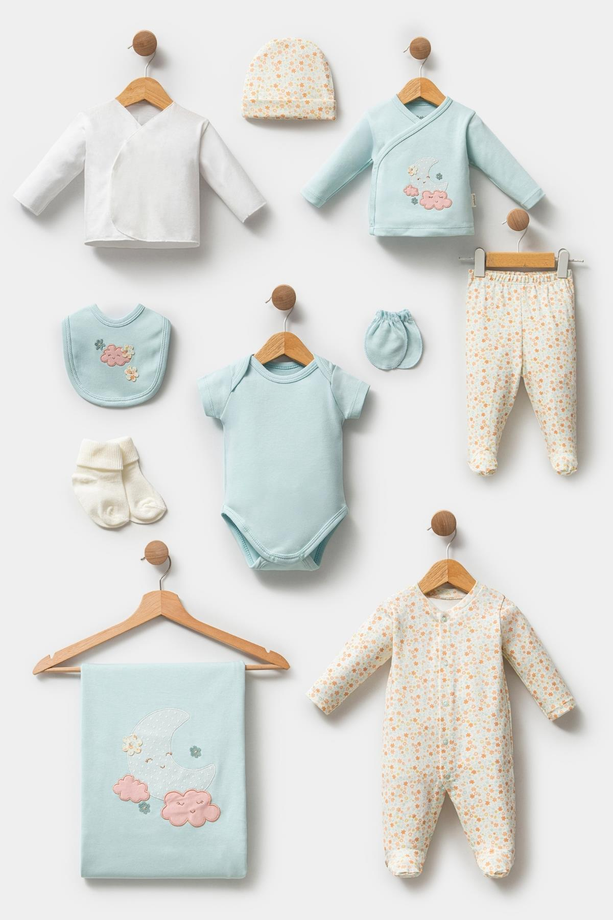 - Sevimli ay ve bulut desenleriyle süslenmiş, yeni doğan bebeklerinize özel tasarlanmış 10 parça hastane çıkışı zıbın seti.
