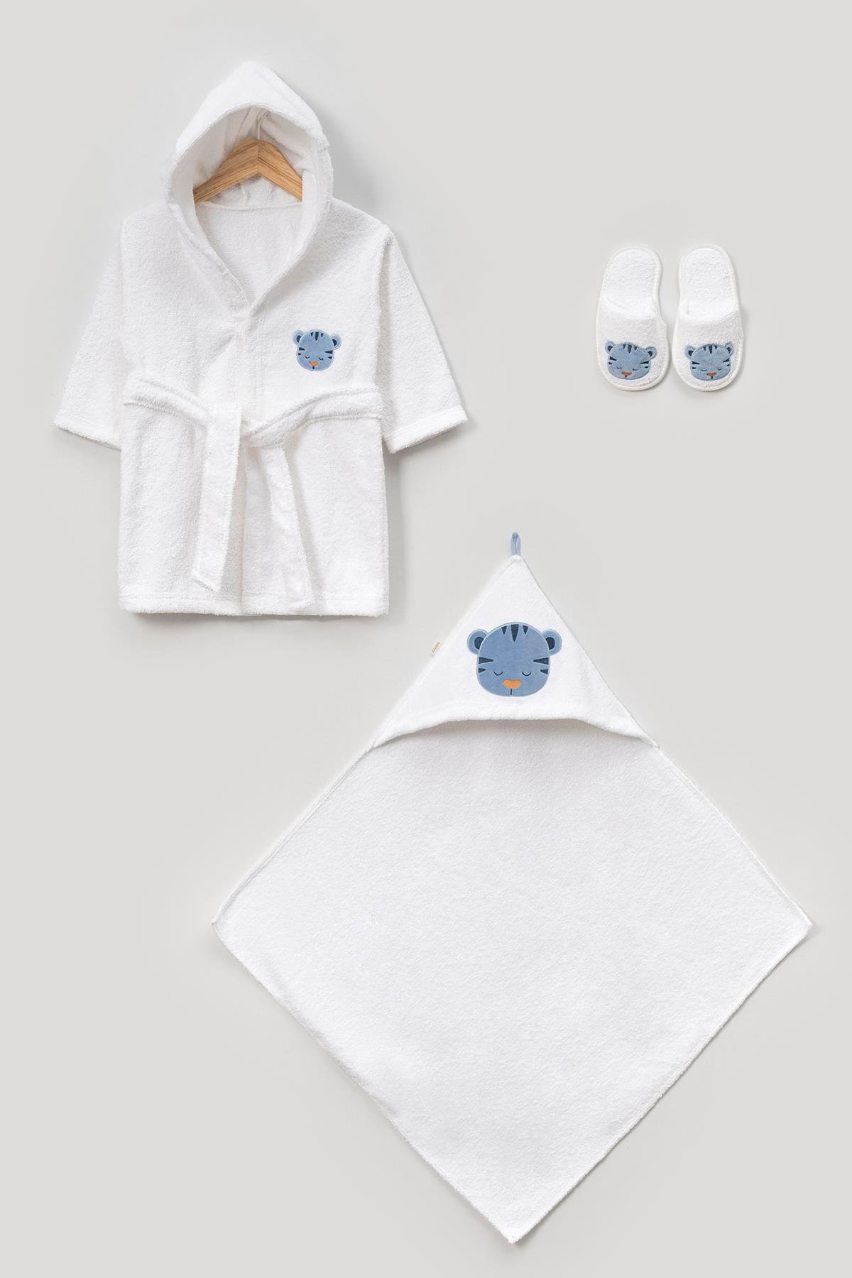 - Üç parçadan oluşan set; bornoz, havlu ve ekstra battaniye içerir.