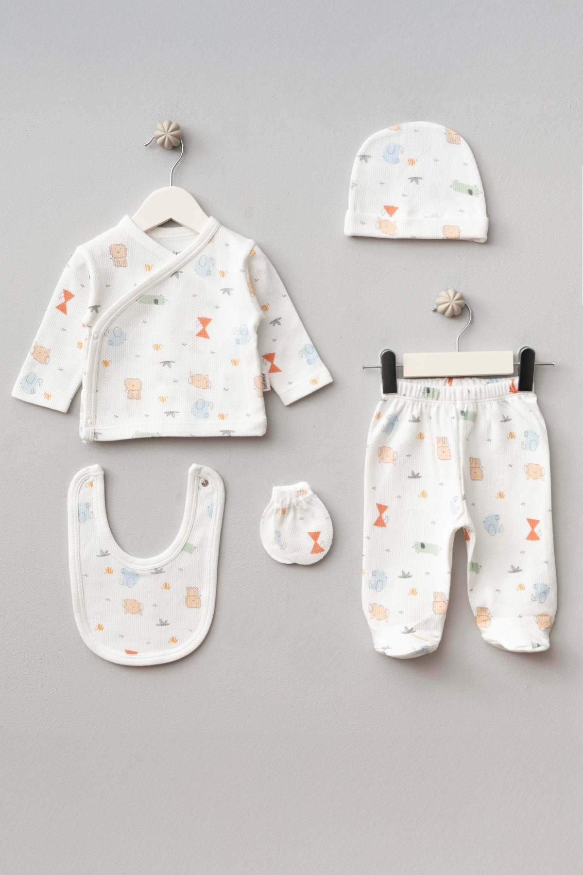- Bebeğinizin cildine zarar vermeyen %100 pamuk materyalden üretilmiştir.- Sevimli kirpi desenleriyle bebeğinizin ilk günlerinde şıklığı ve konforu bir arada sunar.- Ekru rengi ile nötr tonların zarafetini yansıtan bu set, her türlü hastane ortamına uyum sağlar.- Unisex tasarımı sayesinde hem kız hem de erkek bebekler için idealdir; yeni doğan koleksiyonuna özel olarak hazırlanmıştır.- 5 parçadan oluşan set içeriği; zıbın, tulum, bere, eldiven ve patikten oluşur, böylece ihtiyacınız olan tüm temel parçalar tek pakette bulunur.- Günlük kullanım için uygundur; casual tarzıyla rahatlıkla kombinlenebilir.- Yıkama talimatlarına uyarak uzun süreli kullanım imkanı sağlar; ağartıcı deterjan kullanmamanız önerilir.- Sürdürülebilirlik detayına sahip olmasıyla çevre dostu bir seçimdir. - Bebitof Tekstil Ltd. Şti. tarafından kalite standartlarına uygun şekilde üretilmiştir.