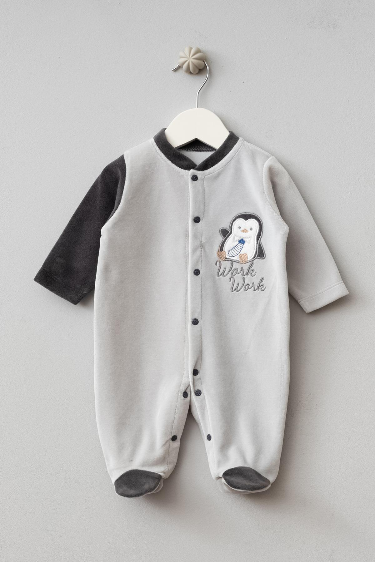 Sevimli Kravatlı Penguen Desenli Pamuklu Bebek Kadife Tulum