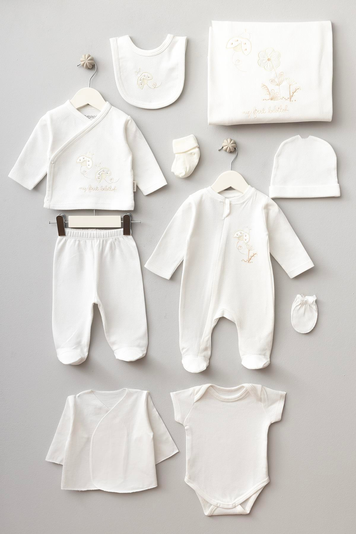 - Yenidoğan bebekler için özel olarak tasarlanmış, sevimli uğur böceği desenleriyle süslenmiş 10 parça zıbın seti.